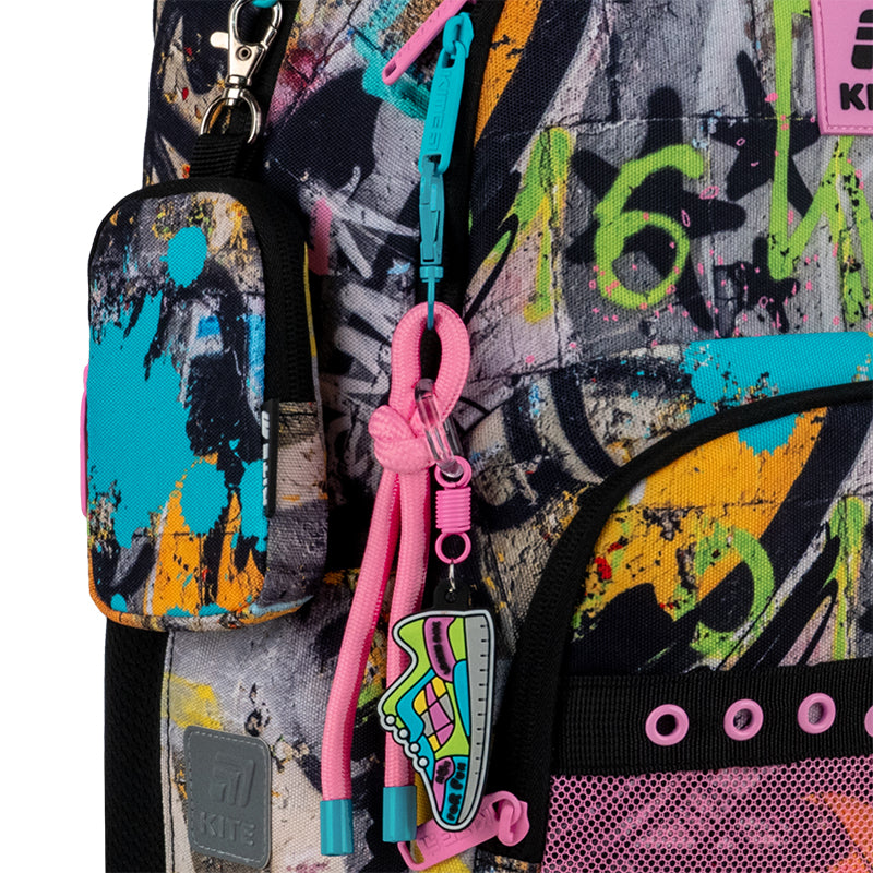 - декор: кольорові металеві люверси, декоративна вставка-сітка на кишені, тасьма з об'ємним друком, брелок-підвіска з паракорду.