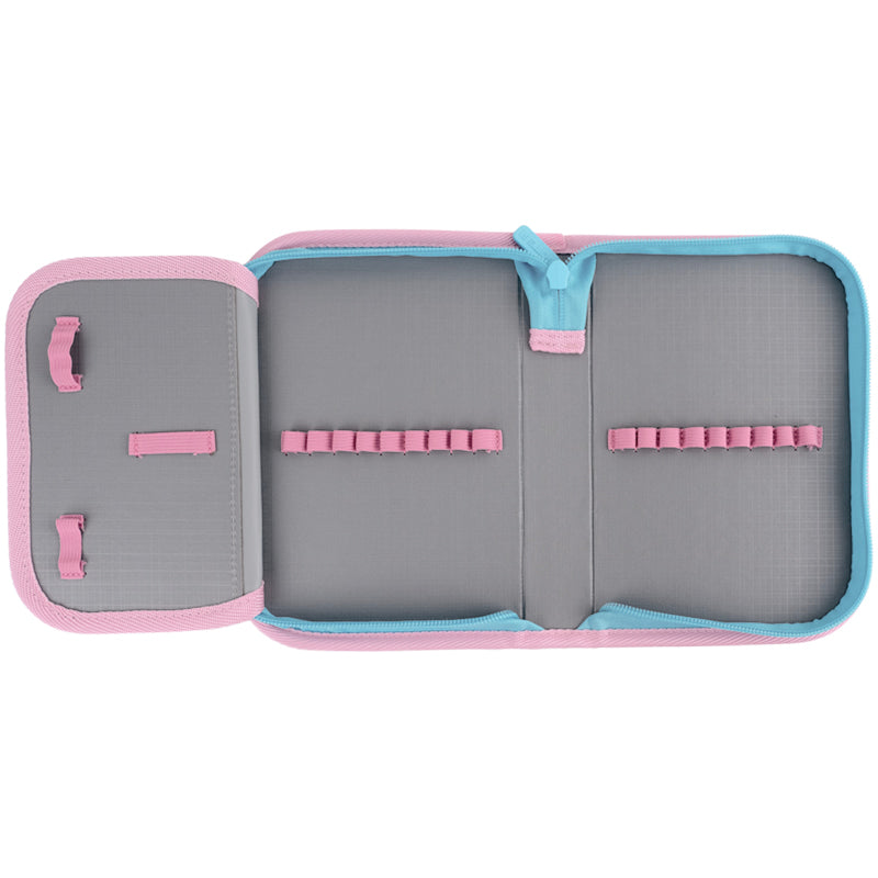 У пеналі легко підтримувати порядок. Ручки, олівці, фломастери, ножиці, гумка та точилка: кожен предмет буде на своєму місці, акуратно закріплений резинкою.
